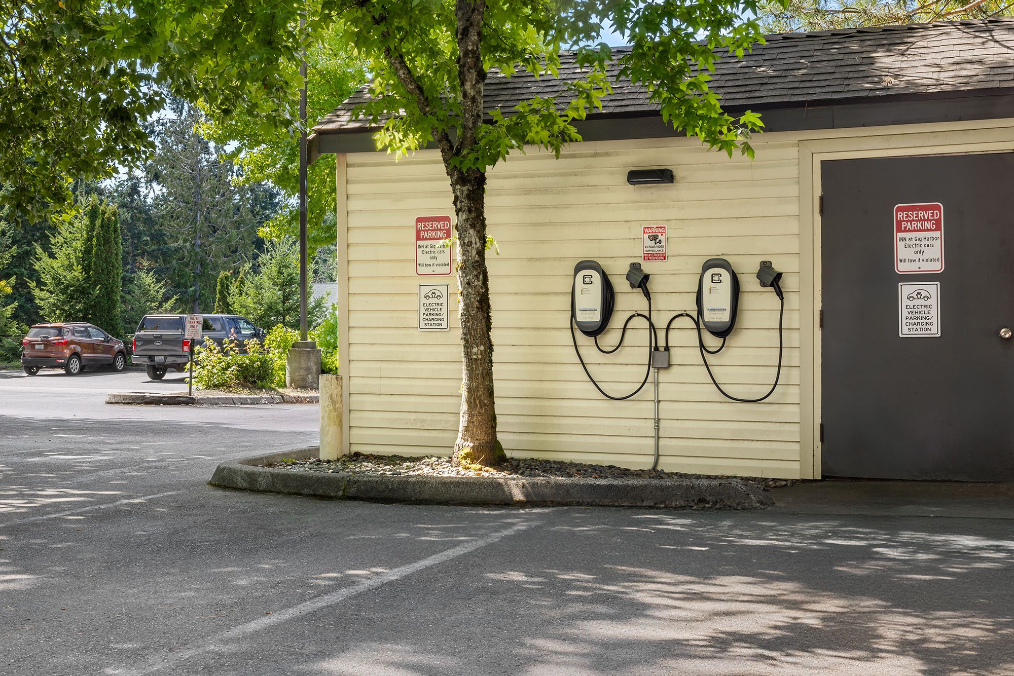 Two complimentary EV charging stations with reserved parking spaces conveniently located in front of the hotel.