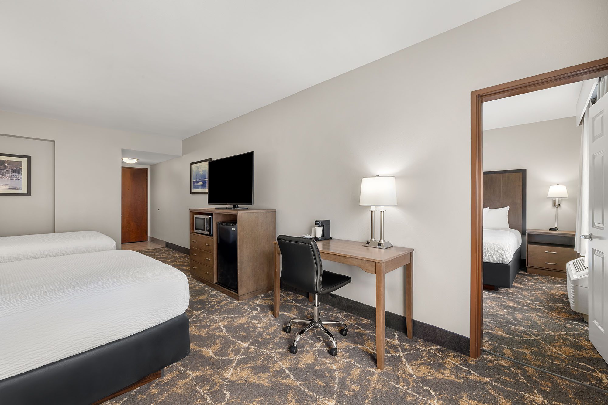 An extended stay suite with two queen beds, sofa and a kitchenette.
